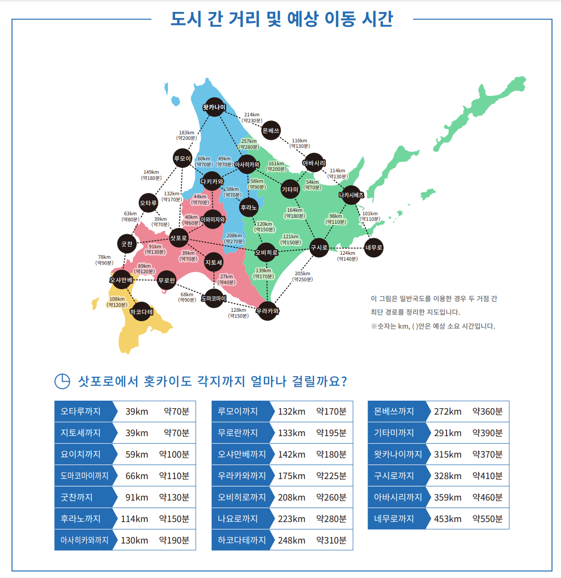 홋카이도 여행을 계획할 때는 이 지역들 간의 거리를 고려해야 합니다. 예를 들어, 삿포로에서 하코다테까지는 차로 약 4시간 15분, 삿포로에서 시레토코까지는 약 5시간 44분이 소요됩니다.