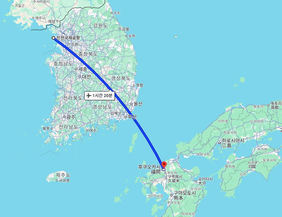한국에서 후쿠오카까지의 비행시간은 그리 길지 않아요.