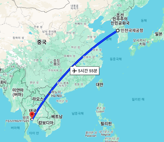 - 인천 - 방콕: 약 5시간 52분